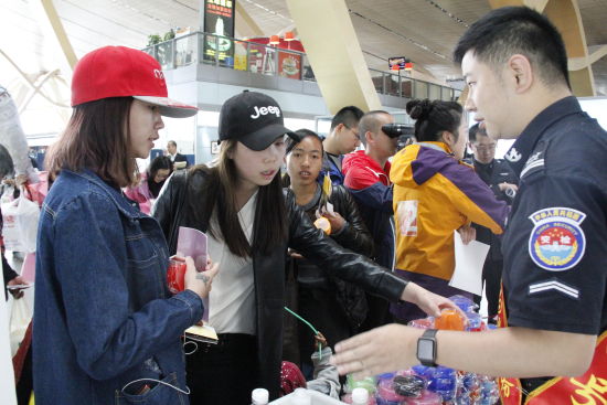 安检志愿者通过知识展板、宣传手册、宣传海报安检咨询等形式,走进人群中讲解液态物品乘机规定