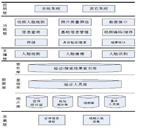 应用层安检系统其它系统视频人脸检测功能层信息查询存储支撑层索引库数据库基础库照片质量筛选基础信息管理身份验证/搜索数据接口视频编码/储存结果统计人脸检测人脸建模人脸识别验证/搜索结果索引库验证人员库相片库采集层证件照片库现场照片库视频库重点人员库证件信息读取视频人脸采集 。